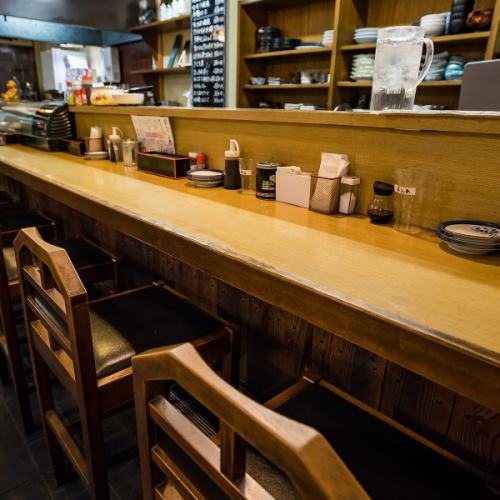 カウンター席は木目調の長い一枚板に、ゆったりとした椅子を配置。目の前で調理の様子が見られ、スタッフとの会話も楽しめる特等席です。仕事帰りにふらっと立ち寄って、串カツとハイボールで一息つくのにぴったりな空間です。