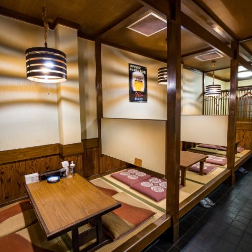 座敷席は畳敷きで仕切りもあり、家族連れやグループでの利用に最適。靴を脱いでくつろげる空間で、お子様にはお菓子サービスも。ポスターや照明の演出も相まって、和の雰囲気の中でゆったりと食事を楽しめます。